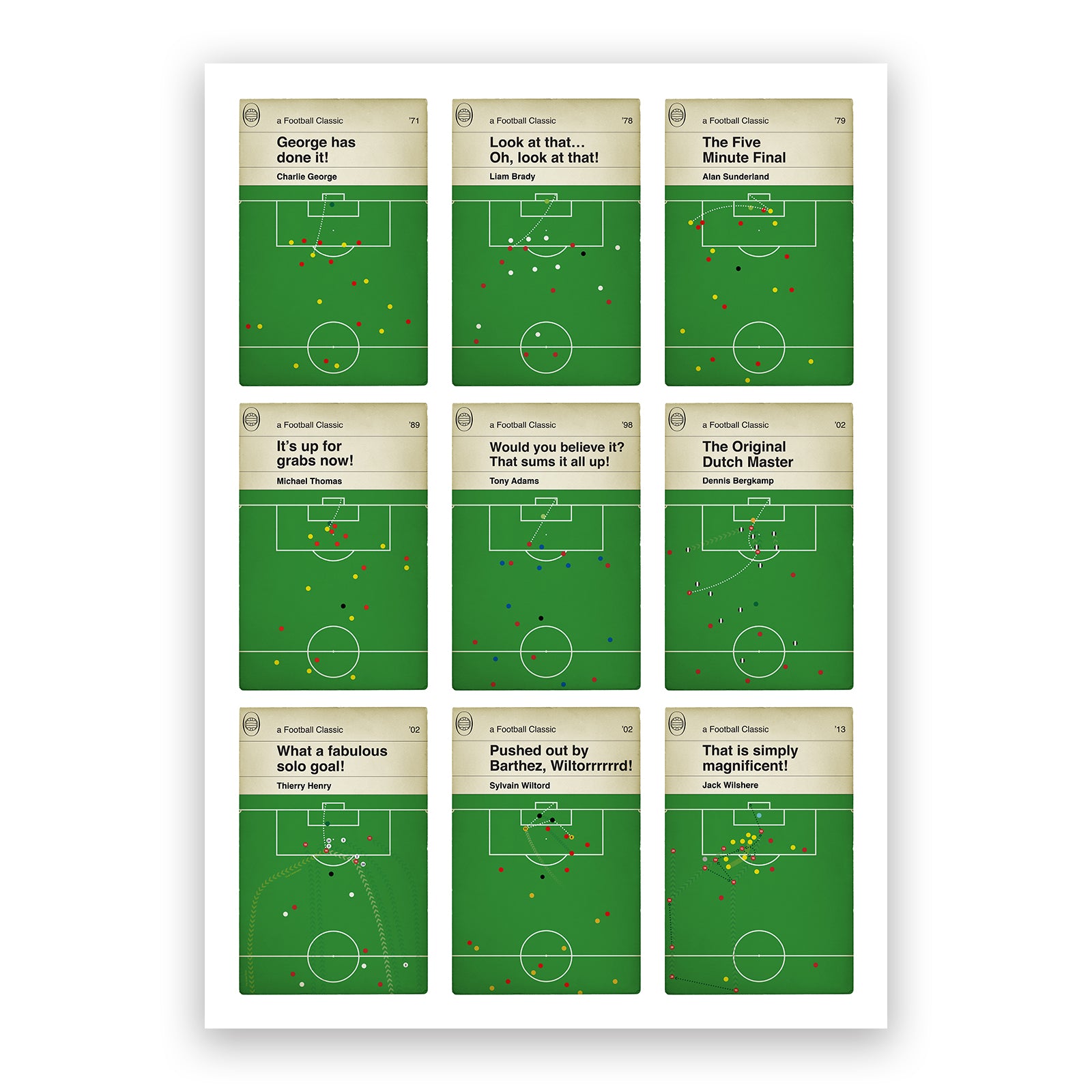 Nine Iconic Arsenal Goals - 9 Up Poster - Brady, Thomas, Adams, Bergkamp, Henry - Classic Book Cover Print - Football Gift (Various Sizes)