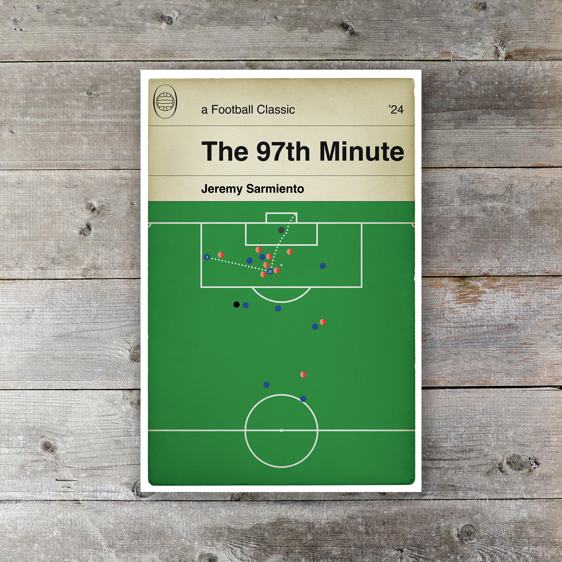 This version illustrates the 97th minute winner scored by Jeremy Sarmiento for Ipswich Town against Southampton in the 2024 Championship. The goal put the Tractor Boys top of the league table as they pushed for automatic promotion.